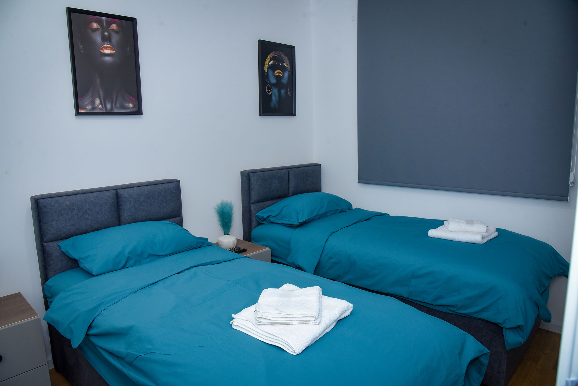 Apartman raspolaže sa dve odvojene spavaće sobe, i to: jednu sa velikim preudobnim francuskim ležajem, a drugu sa dva odvojena kreveta koja se po potrebi mogu i spojiti. Svaka spavaća soba ima svoj TV, velike ormare i noćne stočiće.