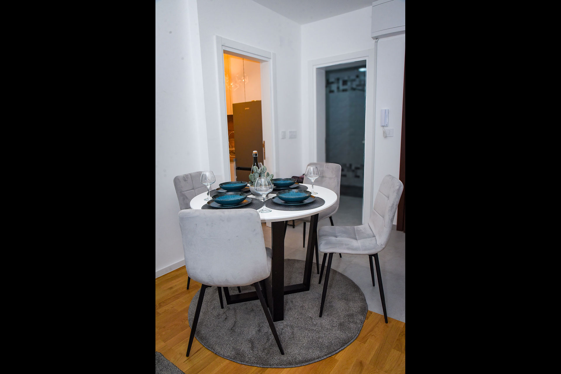 Prostor sa mnogo prirodne svetlosti u kome ćete provoditi najviše vremena vašeg odmora daje toplinu, te ćete se osećati kao kod svoje kuće. Kako bismo vam odmor učinili još potpunijim, možete se opustiti uz ogroman izbor filmova na aplikaciji Netflix. Takođe, ugaona garnitura u dnevnoj sobi se moze razvuci po potrebi, tako da apartman može smestiti 6 odraslih osoba koje će boraviti u 50m2. Kuhinja je kompletno opremljena tako da vam ništa neće faliti. Deo u kome ćete spremati hranu je potpuno odvojen od dnevne sobe.
